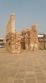 నామమాత్రంగా మిగిలిన ప్రవేశ ద్వారాలు, పునాదులు, కొన్ని చిన్న మందిరాలు మాత్రమే కనపడతాయి. ద్వారం అమర్చబడిన గోడ పైన సుందర శిల్పాలు ఆకర్షిస్తాయి. పూర్తిగా ఎఱ్ఱ ఇసుక రాతితో ఈ కోట నిర్మించబడినట్లుగా తెలుస్తుంది. శ్రీలక్ష్మీ నారాయణ, శ్రీ ఆంజనేయ మందిరాలు పై భాగాన ఉంటాయి.